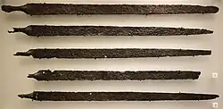 The first currency in Britain appears to have been iron currency bars first appearing around 200BC.[6] Currency bars have been found in four forms known as sword-shaped, spit-shaped, plough-shaped, and bay-leaf-shaped.[6] It has been suggested that these shapes were used to show the origin of the bars.[6] The bars generally weigh between 0.3–0.5 kg (0.66–1.10 lb).[6] Spit-shaped bars are the most commonly found, representing half of all finds.[7] Sword-shaped bars make up another 40 percent.[7]