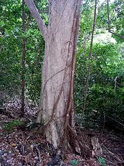 It is a tree growing to 16 metres (52 feet) in height, with whitish bark. The thick, leathery, oval leaves are 5–9 centimetres (2–3+1⁄2 inches) long, 2–4 cm (3⁄4–1+5⁄8 in) wide. Clusters of small flowers, 3–4 millimetres (1⁄8–3⁄16 in) long, appear from November to February. The round, purple fruits are 4 mm in diameter.[1][2]