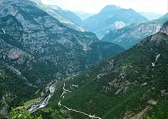 The Cem originates in Kelmend, Malësi e Madhe, Albania and flows through the region of Malësia. The river has two tributaries: the Vukël Cem (Cemi i Vuklit) and the Selcë Cem (Cemi i Selcës), which join at the confluence of Tamarë.[3] The Vukël Cem – the more important of the two in terms of water volume – rises at 900 m (3,000 ft) above sea level and flows for 17.9 km (11.1 mi). It passes through a narrow canyon, a terrain which widens only near Kozhnja, where deposition has formed a small limestone valley. A creek called the Nikç Cem (Cem i Nikçit) contributes to its volume in the rainy period. A small hydropower project has been built where the Cem i Nikçit passes through Kozhnja.[4]