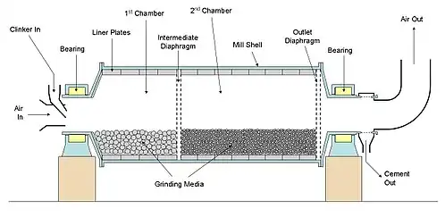 A cement mill (or finish mill in North American usage[1]) is the equipment used to grind the hard, nodular clinker from the cement kiln into the fine grey powder that is cement. Most cement is currently ground in ball mills and also vertical roller mills which are more effective than ball mills.[2]