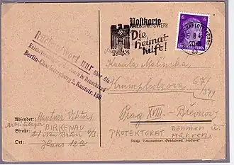 At the beginning of March 1944, Briefaktion was unfolded in Auschwitz, which applied to Jewish prisoners who arrived in Auschwitz and Birkenau.[34] Prisoners who were deported from the Theresienstadt ghetto in Nazi-occupied Czechoslovakia and Berlin provide direct evidence of this operation.[35] On March 5, Jewish prisoners received special postcards, which they were forced to send back to their families and friends.[36] The stamp on postcards informed recipients that these correspondences were passed through the Reich's Union for Jews in Germany (German: Reichsvereinigung der Juden).[37] Prisoners were ordered to falsely state the conditions in the concentration camp that