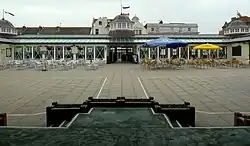 The Central Bandstand with its 1932 frontage has been described as an Art Deco landmark, and one of the first reinforced concrete structures in the UK.[2][3] It straddles the beach and Central Parade just east of the Clock Tower. The back or seaward half, built in 1924, was originally supported above the beach on concrete pillars sheathed in cast iron, so that the stage was level with the main thoroughfare.[4] The tide used to go in and out under the building until at least the 1950s. During World War II when the Pier was out of bounds, anglers were permitted to fish from the rooftop balcony.[5] As of 2013 the beach has risen so that the piers are no longer visible and the sea has receded away from the Bandstand.