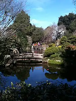 The Japanese Tea Garden was designed by Nagao Sakurai and was installed in 1966.[17][9] Plants featured in the garden include cherry trees, Japanese maples and bonsai.[17] San Mateo set up a sister-city relationship with Toyonaka in 1963,[18] and Toyonaka has donated several sculptures which can be seen in the Tea Garden, including the five-level stone pagoda statue (installed 1963) and a small shinden shrine (in 1991, for the Tea Garden's 25th anniversary).[19] In addition, the Japanese Tea Garden structures include the surrounding fence, a traditional gazebo (azumaya), and a teahouse (chashitsu).[17] The tea garden is open limited hours.