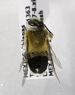 Centris analis is a solitary, oil-collecting bee with a geographical range extending from Brazil to Mexico.[2] C. analis is a small, fast-flying bee with an average head width of 3.21mm and 3.54mm for males and females, respectively.[2] While most species of the genus Centris create burrows for nesting, C. analis and other species of the subgenus Heterocentris build nests in pre-existing cavities rather than in the ground.[3] C. analis is a pollinator of many plant species, especially of those in the family Malpighiaceae, which has encouraged its application in acerola orchards.[4][5]