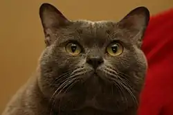 Brachycephalic (literally 'short-headed'): the length of the cranium is shorter than the width, giving the top and sides of the cranium a round shape, often referred to as 'apple-head'.