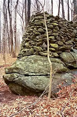 Ceremonial Stone Landscapes is the term used by USET, United Southern and Eastern Tribes, Inc.,[1] a nonprofit, intertribal organization of American Indians, for certain stonework sites in eastern North America. Elements often found at these sites include dry stone walls, rock piles (sometimes referred to as cairns), stone chambers, unusually-shaped boulders, split boulders with stones inserted in the split, and boulders propped up off the ground with smaller rocks.[2][3][4] While neither the age of these sites nor the idea of their creation by indigenous peoples has been accepted generally, interest in the sites is increasing. This interest is generated in part by USET's Resolution #2007:037,[5] entitled Sacred Ceremonial Stone Landscapes Found in the Ancestral Territories of United Southern and Eastern Tribes, Inc. Member Tribes.