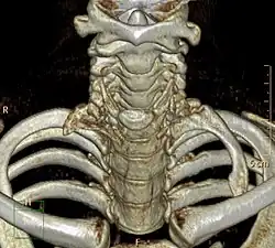 A cervical rib in humans is an extra rib which arises from the seventh cervical vertebra. Their presence is a congenital abnormality located above the normal first rib. A cervical rib is estimated to occur in 0.2%[7] to 0.5%[8] (1 in 200 to 500) of the population.[9] People may have a cervical rib on the right, left or both sides.[10][11]