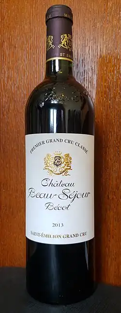 Château Beau-Séjour Bécot, formerly Château Beauséjour-Dr-Fagouet, is a Bordeaux wine from the appellation Saint-Émilion, ranked Premier grand cru classé B in the Classification of Saint-Émilion wine. The winery is located in the Right Bank of France's Bordeaux wine region in the commune of Saint-Émilion, in the department Gironde.