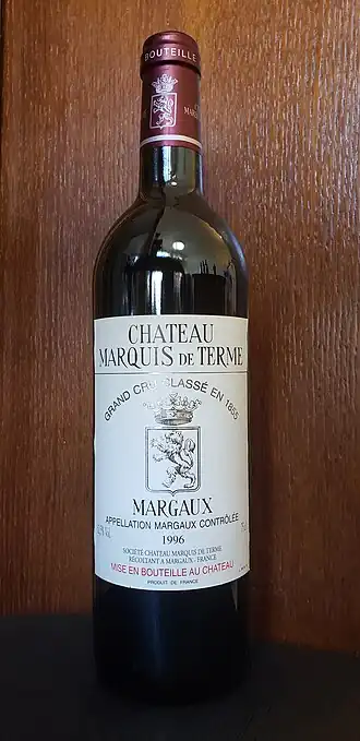 Château Marquis de Terme is a winery in the Margaux appellation of the Bordeaux region of France. The wine produced here was classified as one of ten Quatrièmes Crus (Fourth Growths) in the historic Bordeaux Wine Official Classification of 1855.[1]