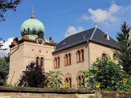 The Synagogue of Ingwiller (French: Synagogue d'Ingwiller) is a square building set on a rectangular plan to the southwest of the former château site. The building is topped by a bulbous onion dome made of copper. The bays of the synagogue are semi-circular and twin-shaped and the front of the Torah is made of paired sandstone.\The tables of the Law are in relief on the south façade. In the northeast corner of the site, there is a house for the rabbi and several outbuildings surround the former moat.[1]