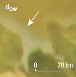 Camaxtli Patera is on the eastern edge of the Chaac-Camaxtli region (15°N,136°W). It is named after the Aztec god of thunder, tornado, and war. There is a hot spot in the patera. Most imaging of the patera come from NIMS, and orbits E15, I24, and I27 of the Galileo flybys.[1] The patera features dark flows on its floor, along with a dark rim, possibly from the lava being erupted from faults at the bases of the walls.[2] There is a moderate abundance of white SO2 concentration in the region.[7] The patera also has a dark halo around it, composed of dark diffuse material.[1][2] The extensive amount of dark material in and around the patera coupled with differences in Voyager and Galileo photos suggests that it is quite active. This observation is supported by NIMS data. The vent location has migrated from the east side to the west side of the patera.[1]