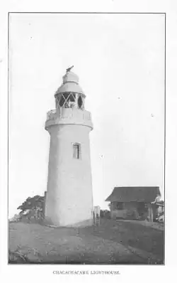 Chacachacare Lighthouse was an active lighthouse located on a hill in the northern part of Chacachacare Island, at an elevation of 236 metres (774 ft). The tower, built in 1897, with masonry, has a cylindrical shape with a balcony and lantern, positioned at a height of 251 metres (823 ft) above sea level. The tower is painted white and has a height of 15 metres (49 ft), the lantern is painted red. During its operational period, it emitted one white flash every ten seconds, visible up to 26 nautical miles (48 km; 30 mi).