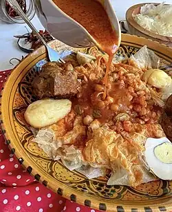 Chakhchoukha or chekhechoukha (Arabic: شخشوخة) is a traditional Algerian dish made from torn or rolled pieces of cooked semolina dough that are served in a tomato-based sauce. The dish consists of small pieces of rougag (thin round flatbread) mixed with marqa, a tomato stew.[1] The dish is typically made by boiling the semolina dough in salted water until it is cooked and then rolling it into small balls or tearing it into bite-sized pieces.