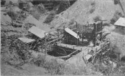A Burleigh compressor was added, and a National drill was used in this work. Safety Nitro No.2 powder was the explosive used. There was a forty-stamp mill on the mine, twenty stamps of which were overhauled and were in running order. The entire plant was operated with water power under a fall of 380 feet (120 m) at the mill and 320 feet (98 m) at the hoisting works. The plant was also provided with steam engines, used in case the water supply was temporarily shut off. A Dodd wheel was employed to run the compressor. Twenty-five men were employed in 1893; miners' wages were $3 per day.[7]