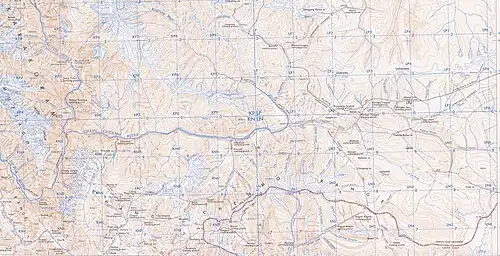 In the middle of the Changchenmo valley, a large spur of the Karakoram Range inserts itself, causing the river to zigzag its way through its hills. The Kongka Pass lies on the last of these hills. To the west of the spur, the large tributary of the Kugrang River flows into the river. To its east the Kyapsang River does the same. Three prominent grazing grounds are found to the west of the Kongka Pass, viz., Kyam (or Kiam, also called Hot Springs),[12] Tsolu (or Tsogstalu), and Pamzal.[13] Another one called Gogra[14] is to the northwest in the Kugrang River valley, where another tributary called Changlung flows into Kugrang.[15]