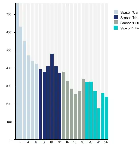 A green cell indicates the actor as a main cast member. A red cell indicates the actor as a recurring or a guest cast member. A grey cell indicates the actor has not participated in the respective season.