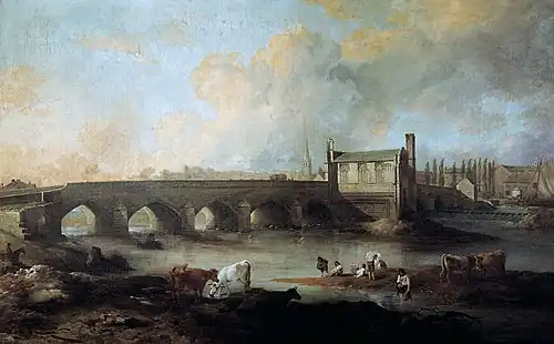 The bridge was widened by nine feet in 1758. It was painted by J. M. W. Turner in 1797, in which year it was widened by nine feet for a second time. This work was probably designed by John Carr of York and undertaken by Bernard Hartley.[1] Wakefield New Bridge was constructed immediately upstream of Chantry Bridge in 1933, and now carries the large majority of traffic.[2] Chantry Bridge was Grade I listed in 1953.[3]