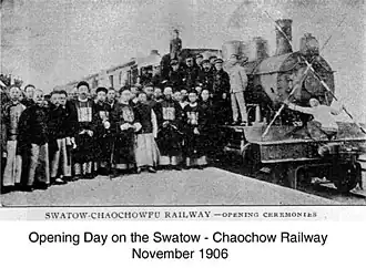 The ChaoChow–Swatow Railway or "Chao-Shan" railway was a privately financed and constructed standard gauge railway which ran between Chaochow (Chinese: 潮州; pinyin: Cháozhōu) and Swatow (simplified Chinese: 汕头; traditional Chinese: 汕頭; pinyin: Shàntóu) in Guangdong Province between 1906 and 1939.[1][2] It's also the first line entirely financed and managed by Chinese merchants.