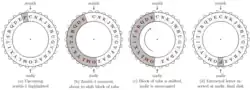 - Physically extract the letter tab found at position zenith-1 (i.e., one counter-clockwise position past the zenith) taking it out of the disk's alphabet, temporarily leaving an unfilled 'hole'.