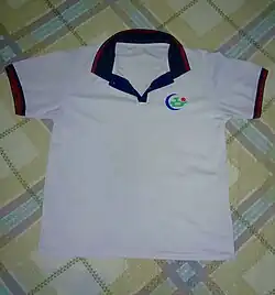 - Summer school uniform coat, white collar and cuff, dark blue pattern with two red stripes, left chest painted emblem.