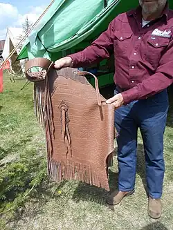 Chaparreras or chaps (/tʃæps, ʃæps/) are a type of sturdy over-pants (overalls) or leggings of Mexican origin, made of leather, without a seat, made up of two separate legs that are fastened to the waist with straps or belt. They are worn over trousers and were originally intended for protecting the rider from the rain and mud, and from tears and injuries.[1][2] They were created to replace armas de agua (water shields) or simply armas (shields), a set of leather flaps that hung from the Mexican saddle to protect the rider's legs from the rain. The word "chaparreras" is believed to have come from either “chaparrón”, a cloudburst or sudden, heavy rain, or from “chaparros”, a Mexican colloquial name for brush and a type of shrub. Due to the difficult pronunciation, Americans shortened the word to Chaps, originally spelled and pronounced schaps or shaps.[3] Chivarras, from chivo (goat), is the name for chaparreras made of goatskins tanned with the hair on.