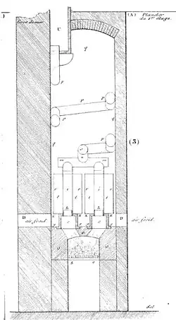 In 1831, the characteristics of innovative calorifiers installed at the Izieux plant were reported.[77] A "six-beehive calorifier", fuelled by coal, replaced six stoves very economically.[80] The even heat prevents the oil from freezing on the looms far from the stoves. The elimination of draughts puts an end to unpleasant odors from the stoves, oils, and gut ropes used to power the looms. The fumes that discolored the silks disappeared. The worker's hands, which no longer have to maintain the stoves, are no longer blackened or chapped by washing; they can handle the silk fabrics without loss. The general temperature is ten degrees Réaumur (or 12.5 degrees Celsius),[81] but is modulated in each workshop to best preserve the silk.[82] The rapporteur points out that this calorifier can also be installed in any building under construction: hospitals, collective or individual housing, etc. It's easy to downsize, as in the Izieux plant, which also has a two-fire calorifier.[83]
