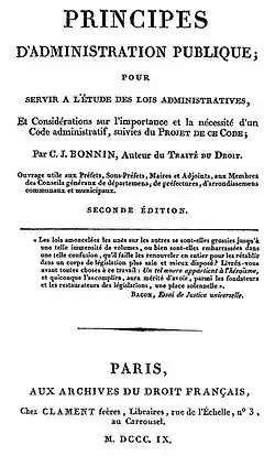 Bonnin, Charles-Jean Baptiste (4 October 1772 in France – October 1846) Progressive French thinker, theorist, and framer of the modern discipline of Public Administration.[1] From Bonnin's written work a great political and intellectual activity is clear. His academic works credit him as a forerunner of public, constitutional and administrative law. Actually, his 'Social Doctrine' situates him amongst the initiators of the science later known as Sociology. He also practiced parliamentary review and was interested in educational problems. Auguste Comte described Bonnin as a "mature and energetic man, a person with a spontaneous deep kinship for positivism and in whom we can find the true spirit of the Revolution".[2]