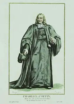 Charles Coffin was born 4 October 1676 at Buzancy, Ardennes in the Duchy of Rheim and educated at College du Plessis. In 1701, he was appointed chief assistant to Charles Rollin, principal of the Collège de Beauvais. He succeeded Rollin as principal in 1712. That same year he was entrusted with the funeral oration for Louis, Duke of Burgundy, the father of Louis XV.[2] In 1718. he became rector of the University of Paris, a post which he held until his death.
