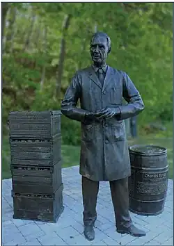 "Dr. Apple" is a sculpture of Eaves by Ruth Abernethy.[11][12] The sculpture consists of the bronze figure, apple barrels and stacked apple crates. The barrels and crates have inscribed plates describing the Eaves' research.[13] The sculpture was commissioned by Allen Eaves to commemorate his father's work at the Kentville Agriculture Centre that extended the storage life of apples and other fruit.[14] Dr. Apple was unveiled by the Mayor of Kentville, David Corkum, on Friday May 29, 2015 at the park opposite the entrance to the Atlantic Food and Horticulture Research Centre, Main Street, Kentville Nova Scotia.[15] This park area will now be known as "Eaves Hollow."[16]