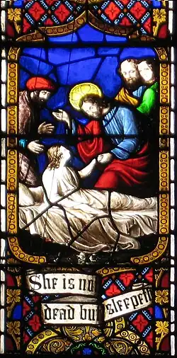Jesus raising Jairus' daughter, detail of a window, c 1859, by Charles Clutterbuck, in Christ Church, St Laurence, Sydney, Australia.