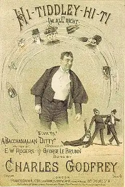 Godfrey performed a varied range of other songs and monologues, including "The Masher King", written and composed by Harry Adams and Edward Jonghmans, and first performed in 1884; a "masher" was a slang term for a dissolute dandy of the type who frequented music halls. Another successful song by Godfrey was "Hi-Tiddley-Hi-Ti" (1890), with lyrics by E. W. Rogers and music by George Le Brunn.[6] Somewhat in contrast was his patriotic 1893 monologue "Fighting with the Seventh Royal Fusiliers", written by Le Brunn with words by Wal Pink recounting an incident supposed to have happened at the Battle of Inkerman. According to General Sir Ian Hamilton, the song generated "an overwhelming rush of recruits" such that "recruiting for the regiment had to be closed for a year."[2] Another well-received song was "It's the English Speaking Race Against the World".[5] Godfrey's performances also included portraits of such British heroes as Francis Drake, Admiral Nelson, the Duke of Wellington and General Gordon.[2] Promoted by Harry Rickards, Godfrey toured in Australia and New Zealand.[4]