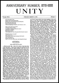 In March 1878 a magazine called Unity had been launched by liberal supporter of the Western Unitarian Conference.[1] The wing of the Unitarian movement represented by the new semi-monthly magazine argued that personal character rather than literal belief in a body of written dogma marked the true "test and essence of religion."[1] These so-called "Unity Men" sought wider acceptance among Unitarians for this fundamental idea of the primacy of ethics over belief — a matter of no little controversy among the more conservative church mainstream of the day.[2] A monthly magazine called Unitarian was established in January 1886 in an attempt to combat the ideas of the "Unity men" — who were seen as undermining Christianity in favor of what was characterized as a new "Ethical Culture."[3]