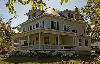 Built in 1910 and designed by an unknown person,[1] the Moore House is a weatherboarded building of two and a half stories resting atop a stone foundation. Brick details the structure, which is topped with a hip roof pierced with dormer windows on multiple sides, covered with slates, and supported with a cornice of brackets. A wrap-around porch with Ionic columns forms much of the facade, sheltering the first floor and providing support to the second. Were the porch removed, an overhang would be present on the right side of the house, as seen from the street.[4] Underneath the porch, the first floor includes a prominent bay window to the right of the main entrance, which sits in the center of the facade. The overall shape of the house makes it typical of the American Foursquare style;[2] this style was common in Wyoming's Village neighborhood, which was home to residents of more typical income than the wealthy denizens of the Wyoming Hills.[3]: 2