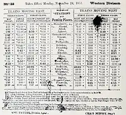- The telegraph has been in use on the Erie since 1852 [meaning practically]. By the concurrent testimony of the superintendents of the road, it has saved more than it cost every year. There is an operator at every station on the line, and at the important ones day and night, so placed that they have a fair view of the track. They are required to note the exact time of the arrival, departure, or passage of every train, and to transmit the same by telegraph to the proper officer. On each division there is an officer called train despatcher, whose duty it is to keep constantly before him a memorandum of the position of every train upon his division, as ascertained by the telegraphic reports from the several stations. The trains are run upon this road by printed time-tables and regulations. When they become disarranged, the telegraph is also used to disentangle and move them forward. When trains upon any part of this road are delayed, the fact is immediately communicated to the nearest station, and from there by telegraph to every station on the road. Approaching trains are thus warned of the danger, and accidents from this cause are prevented.[8]