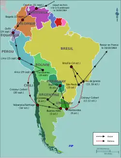 Charles de Gaulle's trip to South America was a series of state visits made by the first president of the French Fifth Republic to South America between September 21 and October 16, 1964. During this trip of three weeks and 32,000 km,[N 1] the longest made by Charles de Gaulle, he visited Venezuela, Colombia, Ecuador, Peru, Bolivia, Chile, Argentina, Paraguay, Uruguay and Brazil.