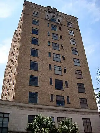 When completed the building was the city's first skyscraper. The bottom two stories were faced with cement molded to resemble cut stone blocks and the upper eight stories were faced with tan brick in the Neo-Classical Beaux Arts style. It is topped by a stone cornice and some windows on the top story are surrounded by pilasters and elaborate spandrel panels. The interior of the building has a two-story lobby, elaborate tile work, and balconies on the upper level. The Charleston Ballroom, located on the second floor, has Corinthian pilasters and weekly dances were held on the open roof garden.[4][5][6]