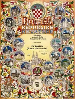 Charter of the Republic of Croatia (Croatian: Povelja Republike Hrvatske) is Croatian state decoration conferred by the President of the Republic of Croatia. It is awarded to international organizations, legal entities, foreign statesmen and Croatian and foreign citizens for their contribution to the development and promotion of the international position of the Republic of Croatia and for their contribution to the scientific, cultural, economic and other development of the Republic of Croatia.[1] Croatian president awards it on his own initiative or on the proposal of the State Commission for Awards and Recognitions of the Republic of Croatia.[1]