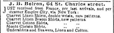 Charvet shirts were imported into the United States as early as 1853 (See figure right).[100] By 1860, Charvet's shirts turnover was equally divided between luxury bespoke shirts sold in the Paris store and ready made shirts for export, particularly to Russia, Great-Britain and Havana.[101] Also, following the custom of the time, designs and models were sold to American stores, to be locally reproduced.[102][103] In the 1920s, Charvet's name was associated in the United States with linen fabrics in "startingly floreated" patterns, used for shirt bibs and cuffs.[104] Nevertheless, into the middle of the 20th century, Charvet was selling only bespoke shirts in the Paris store.[n. 7]