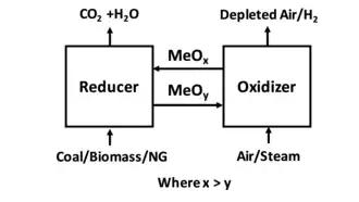 Chemical looping combustion (CLC) is a technological process typically employing a dual fluidized bed system. CLC operated with an interconnected moving bed with a fluidized bed system, has also been employed as a technology process. In CLC, a metal oxide is employed as a bed material providing the oxygen for combustion in the fuel reactor. The reduced metal is then transferred to the second bed (air reactor) and re-oxidized before being reintroduced back to the fuel reactor completing the loop. Fig 1 shows a simplified diagram of the CLC process. Fig 2 shows an example of a dual fluidized bed circulating reactor system and a moving bed-fluidized bed circulating reactor system.