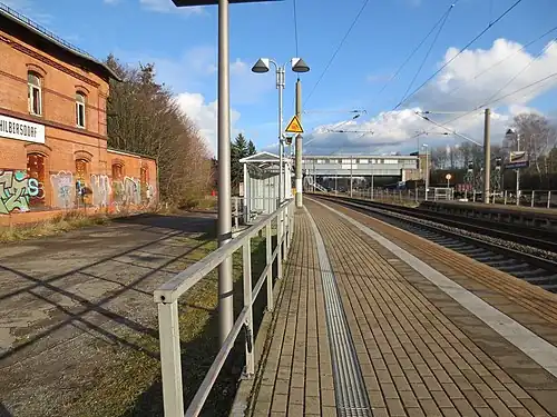 At the opening of the line there was no station in Hilbersdorf, although the municipality, which was independent until 1904, had long sought access to the railway. A "halt point" (Haltepunkt) was not established until 15 August 1893. It was reclassified upwards as a "halt place" (Haltestelle) on 1 January 1899. From then on, it could also handle goods. Originally the station was located in the area of the later marshalling yard; when the marshalling yard was built, the station was moved to its current location closer to Ebersdorf. It was reclassified as a station (Bahnhof) on 2 June 1906.[3]