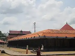 The temple is built in Kerala-style architecture, which is common in all temples in the South Indian state of Kerala. The temple has a two-storeyed gopuram or gateway tower, with the upper story having wooden rails covering the kottupura (a hall of drum beating during festivals). A rectangular wall called the kshetra-madilluka, pierced by gateways, encloses all of the temple's shrines. The metal-plated flagstaff or dvajasthambam is located axial to the temple tower leading to the central sanctum, and there is a deepastambha, which is a lamp post. The chuttambalam is the outer pavilion within the temple walls. The central shrine and the associated hall is located in a rectangular structure called nalambalam. Between the entrance of the nalambalam and the sanctum, there is a raised square platform called a namaskara mandapa which has a pyramidal roof. Thevrapura, the kitchen used to cook offerings to the deity is located on the left of the namaskara mandapa from the entrance. Balithara is an altar used for making ritualistic offerings to demigods and the festive deities. The central shrine called the sri-kovil houses the image of the presiding deity. It is on an elevated platform with a single door reached through a flight of five steps. Both sides of the doors have images of guardian deities called Dvarapalakas. As per Kerala rituals, only the main priest called Thantri and the second priest called Melshanthi can enter the sri-kovil.[6] The central shrine has a circular plan with a base of granite, superstructure of laterite and conical roof made of terracotta tile supported from inside by a wooden structure. The lower half of the sri-kovil consists of the basement, the pillar or the wall, called stambha or bhithi and the entablature called prasthara in the ratio 1:2:1, in height. Similarly the upper half is divided into the neck called griva, the roof tower called shikhara and the finial kalasam (made of copper) in the same ratio. The roof projects in two levels to protect the inner structure from heavy rains during monsoon seasons. The roof of the temple and some of the pillars have lavish wood and stucco carvings depicting various stories of ancient epics, the Ramayana and Mahabharata.[7]