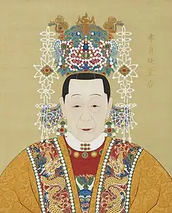 Conflicts among women within the Forbidden City had a negative impact on the emperor's reputation. The first incident occurred on the day of his enthronement, when a dispute arose over the title of Emperor Yingzong's widow, Empress Qian. According to regulations, the title should have been given to the empress dowager, but the emperor's own mother, Lady Zhou, also claimed the same title.[15] Despite being only a consort of Emperor Yingzong, she now held the status of mother to the reigning emperor and thus argued for the same title as Empress Qian.[14] Lady Zhou also emphasized her loyalty to Emperor Yingzong, for which she had suffered alongside him during their years of house arrest from 1450–1457.[15]