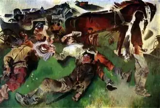 Cherry has been described as a philosophical essay about evil and good of the war.[2] It is one of the most important works by Moiseyenko. It belongs to the series called "Years of Fighting" – a historical epopee, which brought the Lenin Prize to the artist in 1974.[3][4][5] It was again a theme of Russian Civil War in this painting (before there were Cavalry the First (1957), Here Reds are (1961), Friends (1964), Son (1969) and others). Moiseyenko began to make studies for his painting from 1967.[6] He made a few variants of Cherry. The last one took a year.[7] Cherry was presented for the first time at the largest exhibition, the "Fine Arts of Leningrad" in Moscow, 1976.[8] The Russian Museum has Cherry in its collection.