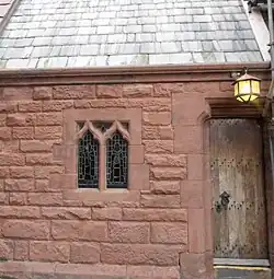 Chester College was built between 1839 and 1842 as the first purpose-built teacher training college in England. Its chapel was added between 1844 and 1847.[2] The chapel was designed by the Manchester architect J. E. Gregan, and its construction was assisted by the students of the college, who helped to quarry and carve the stone, to carve the woodwork, and to work with the stained glass.[3] The chapel has since been incorporated into the University of Chester.[4]