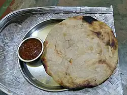 Dishes like Chila and Phara are favourites. They are made with rice flour and eaten with spicy or tangy chutney of tomato, chilli and coriander. Chila is made by making a thick mixture of water and rice flour and then made like a plain dosa. On the therapy side phara is made by leftover rice and rice flour by making a dough and then make cylindrical shapes and giving tadka with jeera, mustard, curry leaves, tomato, turmeric, salt and chili. People of Chhattisgarh do not waste food. People eat Baasi here. It is left over rice dipped in water and curd and eaten with chutney.[8]