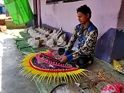 These chhau masks are made by the artists by the Sutradhar community. The making of a mask goes through various stages. 8-10 layers of soft paper, immersed in diluted glue, are pasted one after another on the mould before the mud mould is dusted with fine ash powder. The facial features are made of clay. A special layer of mud and cloth is applied and the mask is then sun-dried. After this, the mould is polished and the second round of sun drying is done before separating the layers of cloth and paper from the mould. After finishing and drilling of holes for the nose and eyes, the mask is coloured and decorated.[25][26]