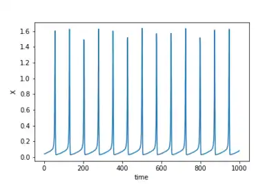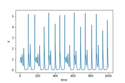 in which, is called activation or action potential variable, and is the recovery variable. The model has four parameters, is a time-dependent additive perturbation or a constant bias, is the time constant of recovery , is the activation-dependence of the recovery process and is an offset constant. The model has a rich dynamics, presenting from oscillatory to chaotic behavior,[3][4] as well as non trivial responses to small stochastic fluctuations.[5][6]
