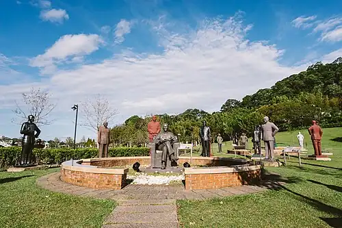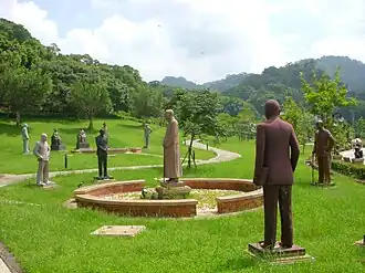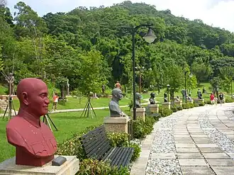 In 2000, it was estimated there were nearly 43,000 Chiang statues in various locations throughout Taiwan.[3] Daxi District, home to the mausoleums of Chiang Kai-shek and his son, Chiang Ching-kuo, has accepted approximately 200 removed Chiang Kai-shek statues, beginning in 2000 as per the then-current mayor (Tzeng Rung-chien)'s policy.[3][7] The statues were later displayed at the Cihu Memorial Sculpture Garden (慈湖紀念雕塑公園), located at 24°50′29″N 121°17′38″E / 24.8415°N 121.2940°E adjacent to the Cihu Mausoleum. It is also known among expat residents as the 'Garden of the Generalissimos'.[8] The garden is especially popular with visitors from the People's Republic of China.[9][10]