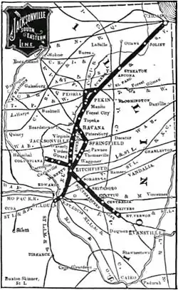 Both lines, connecting Jacksonville and Springfield to Pekin, were sold to the Wabash in 1881, but, after the Wabash defaulted, the lines were sold in mid-1888 to a new Chicago, Peoria and St. Louis Railway,[3][6] a subsidiary of the Jacksonville Southeastern Railway (reorganized in 1890 as the Jacksonville, Louisville and St. Louis Railway). The latter company, with a main line from Jacksonville southeast to Centralia via Litchfield, soon assembled a system - the "Jacksonville Southeastern Line" - by leasing the St. Louis and Chicago Railway (Springfield to Litchfield) in September 1890, and building, as a part of the Chicago, Peoria, and St. Louis, a line from Litchfield southwest to Madison (near East St. Louis). The connection to East St. Louis was completed in November 1890, and in December the company inaugurated, in cooperation with the Atchison, Topeka and Santa Fe Railroad, a through Pullman car passenger service between Chicago and St. Louis.[2][7][8]