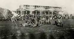 After a 12-year hiatus resulting from Michigan's withdrawal from the Western Conference, the rivalry resumed on November 9, 1918, at Stagg Field in Chicago.[75] The Michigan team was reported to be determined to avenge the 1905 team's 2–0 loss to the Maroons.[76] The game was played as negotiations were underway to end World War I, and the Chicago Daily Tribune wrote: "While the nations of the world are hoping for an armistice, the resumption of hostilities between forces guided by Gens. Yost and Stagg brought joy to thousands of football fans, and the opening battle attracted approximately 7,000 of them."[45] Michigan won the 1918 game by a 13–0 score.[77]